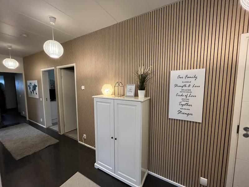 Evellan Slim line akustinen sisustuslevy yhdistää tyylikkään designin ja tehokkaan äänenvaimennuksen. Sen runko on valmistettu 100 % kierrätetystä PET-huovasta. Paneelin pinta on viimeistelty aidolla puuviilulla, joka tuo luonnollista lämpöä tilaan.