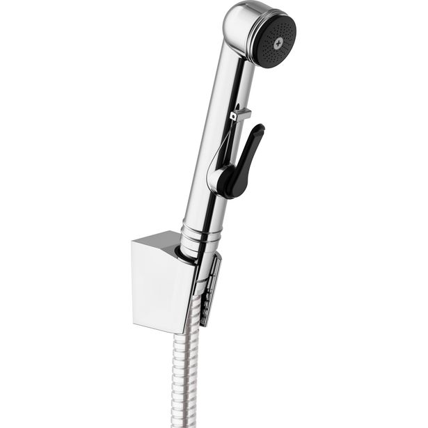 Näppärä, kromin värinen Damixan bideesuihku sisältää myös saman värisen seinäpidikkeen. Käsisuihku on valmistettu muovista.