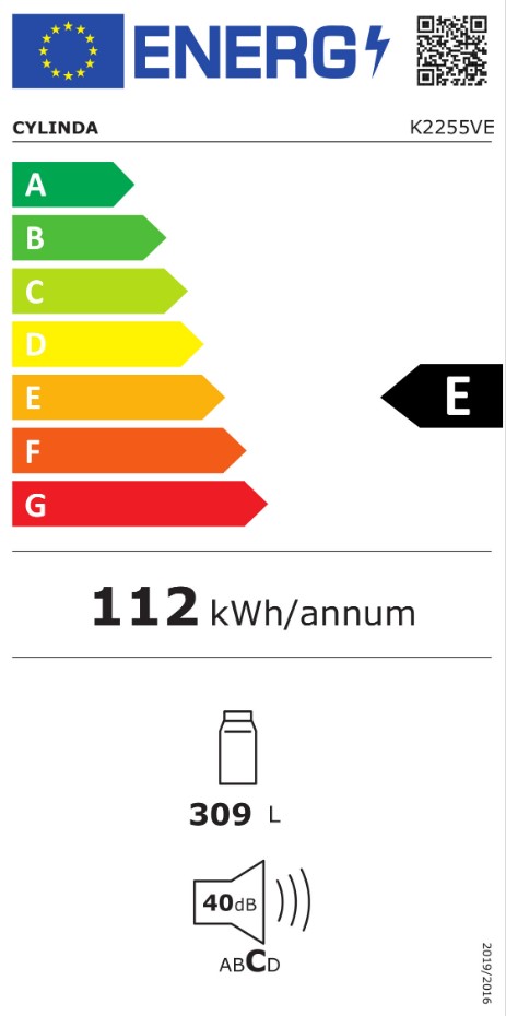 Jääkaappi Cylinda K2255VE, 595x650x1550mm, valkoinen, 309l