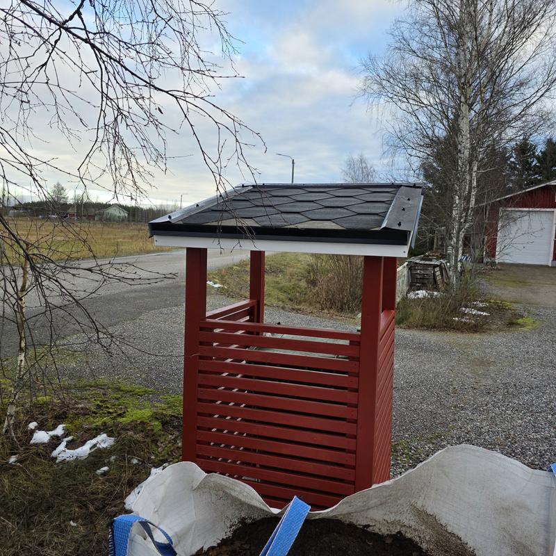 Siisti jätekatos, mutta rimpula katto★★★★★★★★★★Tuote oli hyvin pakattu, helppo koota ja siisti. Ainoa miinus oli vaatimattomat katto- ja räystäslaudat, jotka eivät kestäneet huopakatteen naulausta. Jonkinlainen kate olisi hyvä olla, koska katemateriaali ei kuulunut pakettiin, ei paketissa ollut myöskään ohjetta katteen kiinnittämiseen.Oliko arvostelu hyödyllinen?Oliko arvostelu hyödyllinen?