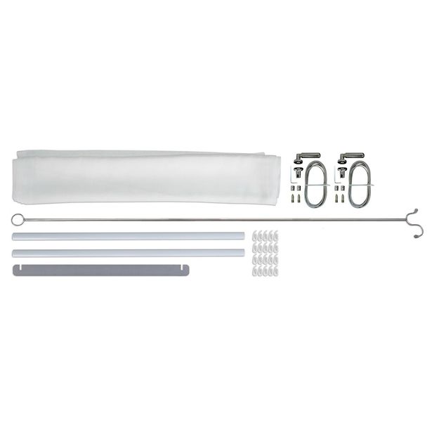 - Verhoyksikkö sisältää: 1 varjostinverho (290x54cm), 2x valkoinen metallitanko (19mmx60cm), 20x muovikoukku, 2x venytettävä verhokaapeli + metallikaapeli (320cm x 2mm, päällystetty pvc-muovi)