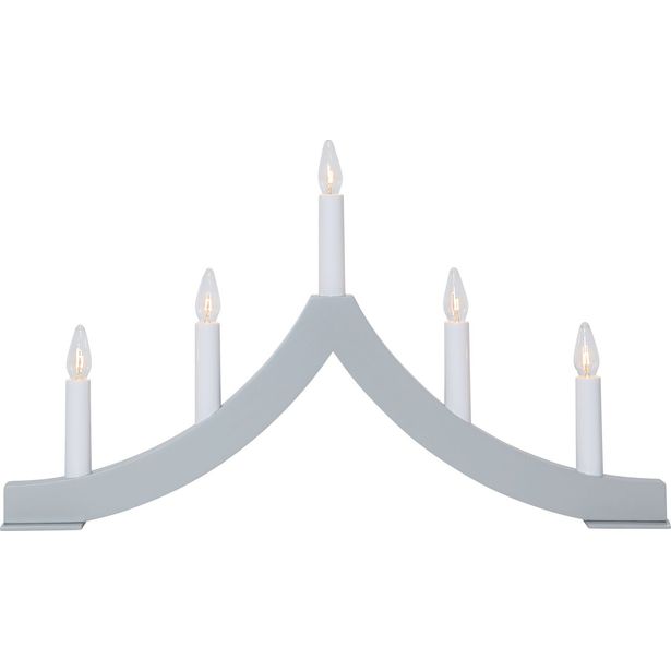 Star Tradingin tyylikäs ja elegantti viisihaarainen, harmaa Pagod -sähkökynttelikkö, jonka on suunnitellut Charlotte Falck. Puusta valmistetun kynttelikön leveys 45 cm, korkeus 27 cm ja syvyys 6 cm. Tuote sopii sisäkäyttöön. Kynttelikössä on 5 vaihdettavaa E10-kantaista lamppua, joiden paloaika on noin 1000 tuntia. Valon sävy on lämpimän valkoinen. Virtajohto on pituudeltaan 180 cm ja siinä on katkaisija.