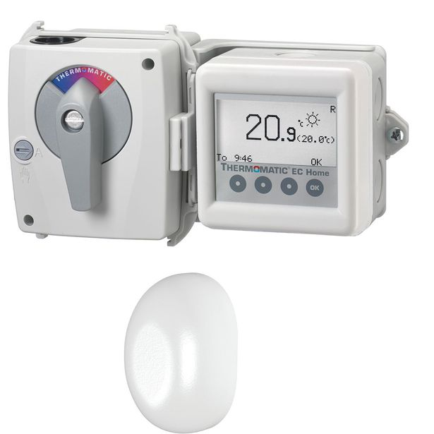 Thermomatic EC Home on yksinkertainen, valikko-ohjattu lämmönsäädin, jossa on huoneanturi ja sisäänrakennettu viikkokello. Ulkoantureita on saatavana lisävarusteena.