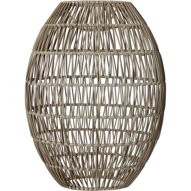 Beige polyrottingista valmistettu lampunvarjostin, jonka halkaisija on 30 cm ja korkeus 40 cm. Sopii ulkokäyttöön.