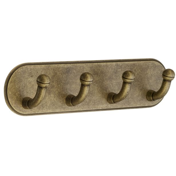 Tällä Beslagsbodenin Design-malliston nelikoukulla ei heti lopu ripustustila kesken. Neljä koukkua on päällystetty järisyttävän tyylikkäällä antiikkimessingillä, ja sen alla salaa varsinaisen kannattelutyön tekee lujaakin lujempi ruostumaton teräs. Voit kiinnittää Design-naulakon tarrakiinnityksellä vaikkapa kaakelille.