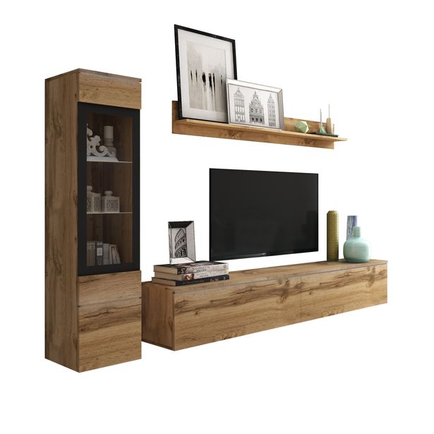 - Vitriini: leveys: 30 cm, korkeus: 130 cm, syvyys: 33 cm, Ripustettava hylly: leveys: 139 cm, korkeus: 18 cm, syvyys: 14 cm, RTV-kaappi: leveys: 180 cm, korkeus: 30 cm, syvyys: 33 cm