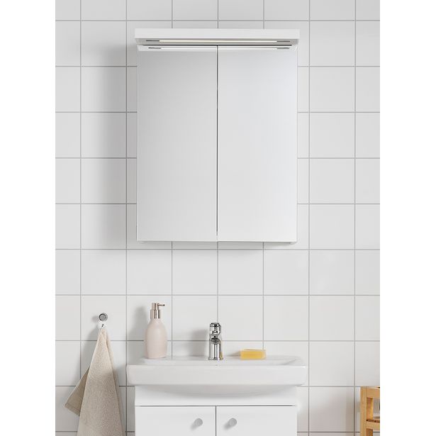 Valkoisessa Hafa Life -peilikaapissa on kaksipuoliset, pehmeästi sulkeutuvat peiliovet ja siirrettävät lasiset hyllyt. Tyylikkään kaapin yläosassa on miellyttävä LED-valaistus, ja 230 V pistorasia on kaapin sisällä yläoikealla. Peilikaapin suojausluokka on IP44.