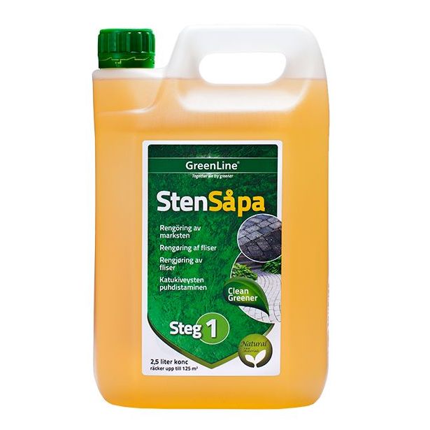 Greenline puhdistusaineella puhdistat kaikenlaiset ulkotilojen kivipinnat tehokkaasti. Aine on ympäristöystävällinen ja sisältää vain luonnollisia ainesosia. 2,5l tiiviste riittää 125 m² alueen perusteelliseen puhdistukseen.