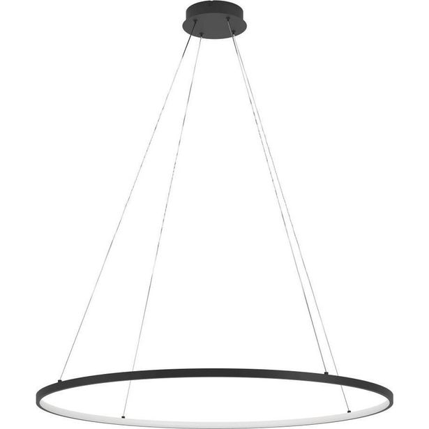 Pyöreä, upea LED-riippuvalaisin, jossa kehämäinen lähes metrin halkaisijaltaan oleva valaisinosio yhdistyy neljällä vaijerilla kattokiinnikkeeseen. Integroidut 40W ledit tuottavat tuotteen mukana tulevalla kaukosäätimellä säädettävää (valon väri + kirkkaus) valkoista valoa välillä 2700-6500K. Kiinnitys kattopintaan, sokeripalaliitäntä. Vain sisäkäyttöön, IP20