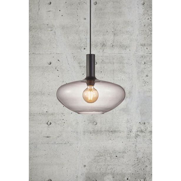 Kaunis ja elegantti riippuvalaisin, jonka savunharmaa lasivarjostin saa valon hehkumaan pehmeänä ja lämpimänä. Valaisimen korkeus on 30 cm ja halkaisija 35 cm. Valaisimeen sopii E27-kantainen valonlähde, jonka teho on enintään 60W. Valonlähde ei sisälly toimitukseen. Valaisimen ripustusjohto on 300 cm, joten sen voi sijoittaa korkeaankin tilaan. Kattokuppi on mustaa metallia, ja sen halkaisija on 12 cm ja korkeus 2,5 cm.