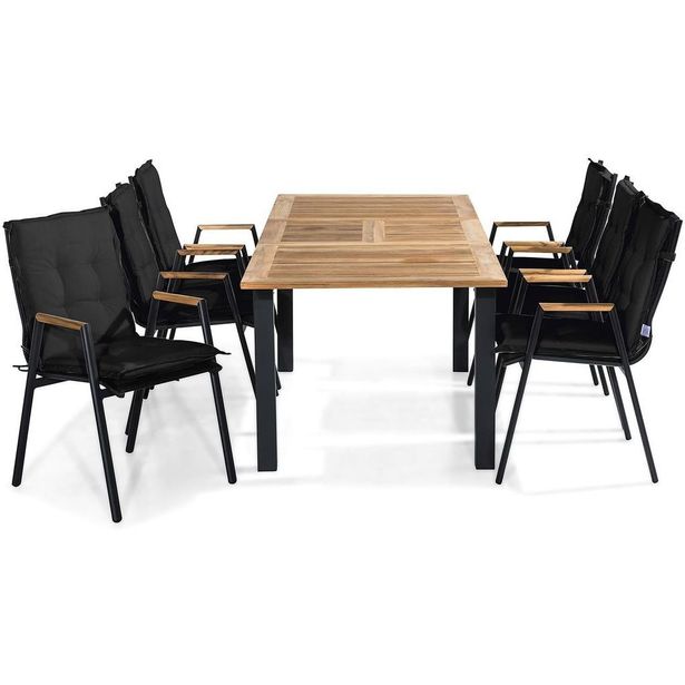 Las Vegas -ruokailuryhmä saman sarjan runkotuoleineen on tyylikäs ruokailuryhmä kaikille patioille. Ruokailuryhmä koostuu alumiinista ja tiikistä valmistetusta jatkettavasta pöydästä sekä alumiinista, tiikistä ja tekstiileistä valmistetuista pinottavista tuoleista. Jatkettavan pöydän pituus voi olla 152-210 cm ja sen äärelle mahtuu koko perhe. Kevyen alumiinimateriaalin ansiosta pöytä voidaan helposti vetää ulos tarvittaessa ja koko ruokailuryhmä on helppo siirtää haluamaasi paikkaan. Tuolien istuin on valmistettu kestävästä tekstiileistä, joka kestää säätä ja tuulta ja on helppo puhdistaa.