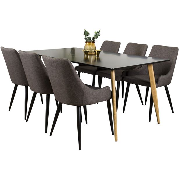 Täydellinen kuuden hengen ruokailuryhmä! Ryhmään kuuluu tyylikäs ja ajaton Polar-pöytä sekä kuusi Plaza-tuolia. Ruokapöytä on valmistettu MDF:stä ja siinä on metallijalat. Tuoleissa on kauniisti verhoiltu, pehmustettu istuin ja metallijalat. Tämän kokonaisuuden avulla luot helposti toimivan ja viihtyisän ruokailutilan.