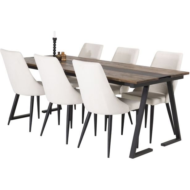 Ruokailuryhmä Venture Home, 200x90cm Jakarta-pöytä + 6 beigeä Leone-tuolia, vakosametti