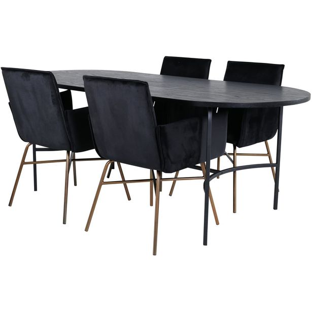 Ruokailuryhmä Venture Home, 200x90cm musta Skate-ruokapöytä + 4 mustaa Petra-tuolia, sametti