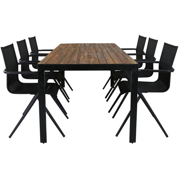 Ruokailuryhmä Venture Home, 205x90cm akaasia/musta Bois-pöytä + 6 mustaa Alina-tuolia