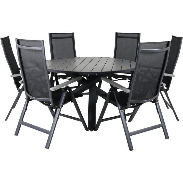 Venture Home -ruokailuryhmä tuo patiolle kutsuvan tunnelman. Tässä setissä yhdistyvät ø140cm pyöreä Parma-pöytä ja kuusi Albany-sarjan taittotuolia. Tuoleissa on säädettävä selkänoja, mikä takaa mukavuuden pitkillekin illallisille.