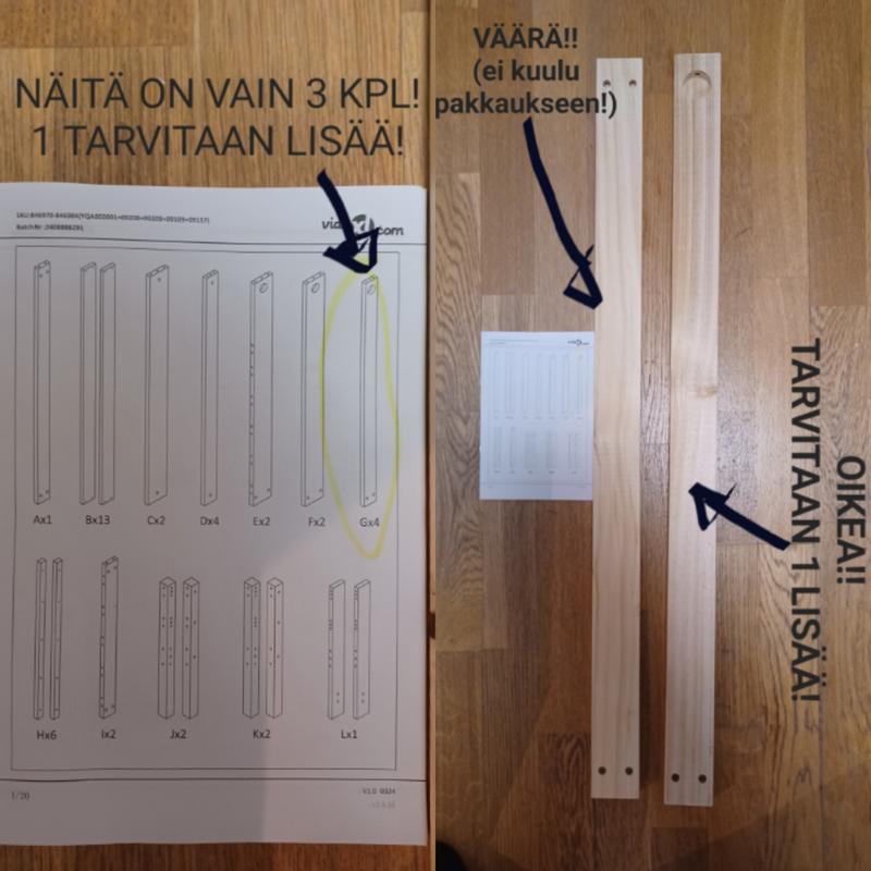 Huono laatu ja puuttuvia palasia★★★★★★★★★★En suosittele tuotettaEkassa lähetyksessä puuttui osa. Tuli toinen paketti jossa myös virheellisiä palasia, onneksi jättivät ensimmäisen virhe paketin meille jotta saimme vaihdettua palasia ja saimme sängyn koottua. Omat ruuvit piti ostaa koska paketissa olevat eivät menneet pohjaan kiinni (huono laatu vääntyi heti). Lisäksi miinusta siitä että oikeasti kaikki palat olivat irrallisia, jopa sivu lauta oli 3:ssa osassa. Onnea vaan matkaan seuraavalle!Oliko arvostelu hyödyllinen?Oliko arvostelu hyödyllinen?