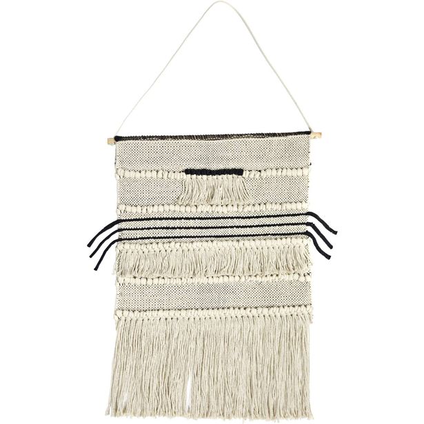 Tämän Liviannan seinävaatteen ryijymäinen pinta yhdistelee kauniisti erilaisia solmuja ja hapsuja toisiinsa. Luonnonvalkoiseen seinävaatteeseen on yhdistytetty mustia yksityiskohtia. Hoitona säännöllinen imurointi ja tuuletus.