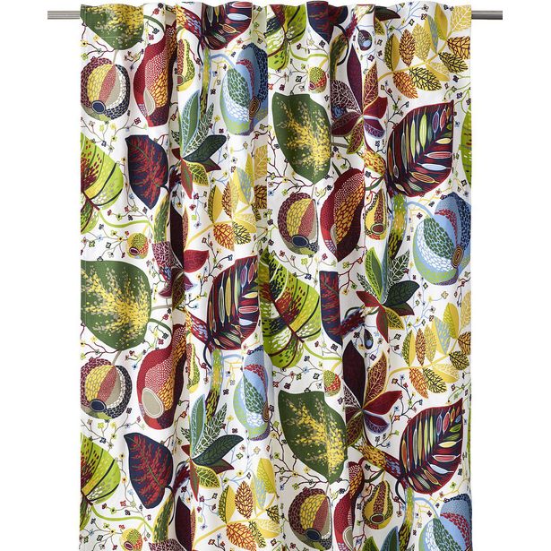 Pitkät sivuverhot puuvillaa, painettu Adam & Eva -kuviointi. Verhoissa on monitoiminauha yläreunassa, päärmätyt sivureunat ja yliluotteluommel alareunassa. Pakkaus sisältää 2 verhoa, joiden koko on 145 x 250 cm.