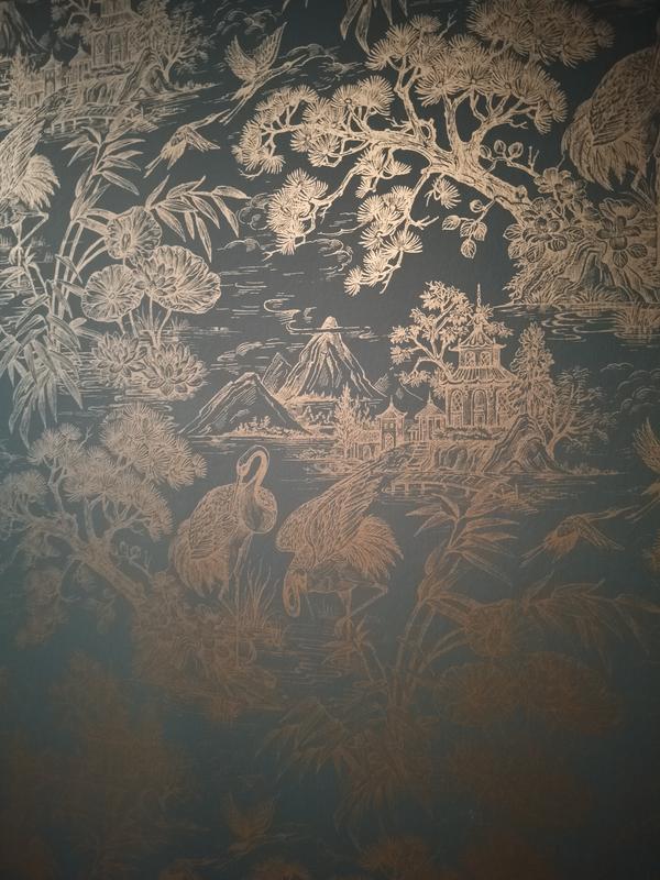 Holden Decorin Arboretum-malliston Natoru-tapetti metalliväreissä. Natoru on itämaishenkinen non-woven-tapetti, jossa on kurkia, rakennuksia ja kasveja. Tapetin pinnassa on hohtavia kuvioita. Tapetissa on sileä pinta.