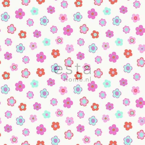 Ilakoiva pinkillä, turkoosilla ja korallinpunaisella väritetty kukkatapetti, joka sopii mainiosti käytettäväksi joko yksinään tai vaikkapa selkeiden raidallisten ja yksiväristen tapettien kanssa.
