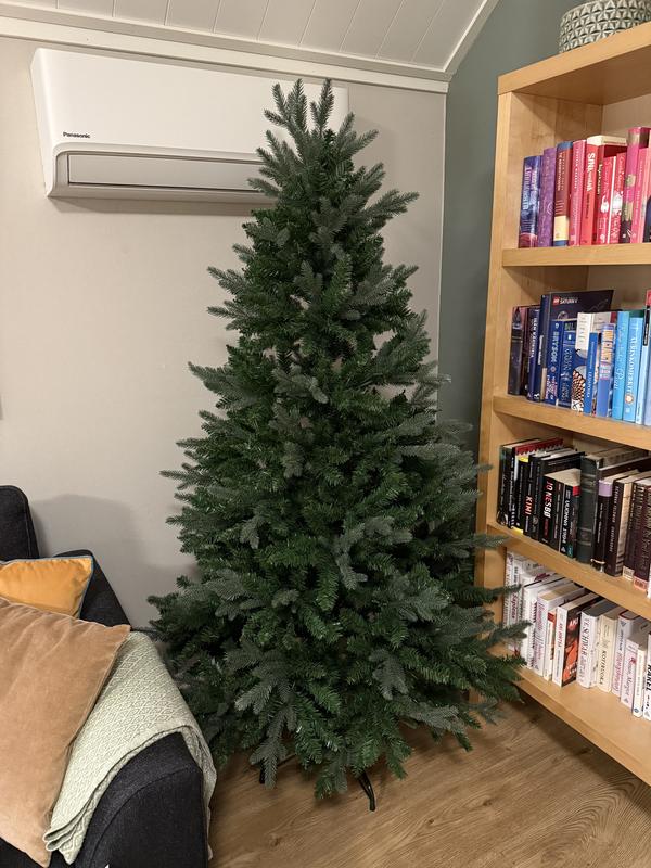 Paksuoksainen, tummanvihreä, upea tekojoulukuusi sisäkäyttöön. Kuusen korkeus on 180 cm ja halkaisija 115 cm.
