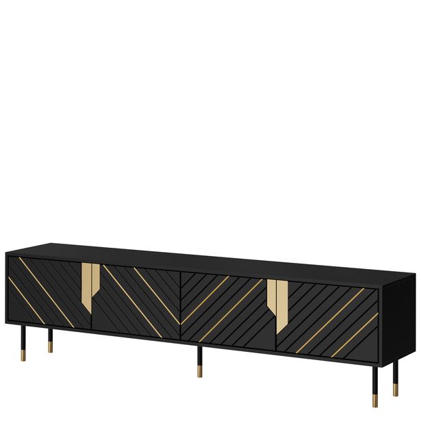 TV-taso MOUNTAIN 200 4D by Nomla tuo kotiisi tyylikkyyttä mustan ja kullan sävyillä. Valmistettu Puolassa laadukkaista materiaaleista, kuten matta mustasta MDF:stä ja kultalakatuista elementeistä, tämä suorakulmainen TV-taso on yhtä aikaa ajaton ja moderni. Hienostuneet jyrsityt etulevyt ja kätevä "PUSH TO OPEN" -avausjärjestelmä lisäävät käyttömukavuutta. Korkeat mustakultaiset metallijalat varmistavat tukevuuden, ja tasapainoinen muotoilu täydentää olohuoneen sisustuksen. 24 kuukauden takuu antaa lisäturvaa valinnallesi.