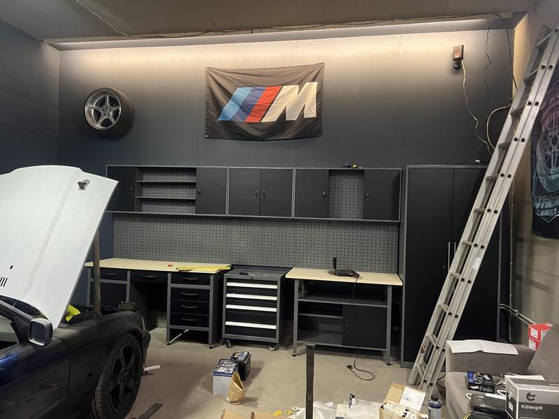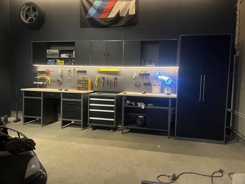 Välitila on täynnä reikälevyseinää, joihin voi halutessaan asentaa koukkuja, telineitä, tasoja yms. työkaluja ja tarvikkeita varten. Kaikki yhdeksän kaappia sekä työkaluvaunu ovat lukittavia. Toimituksen mukana tulee kaksi avainta.