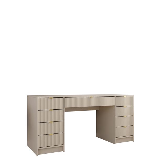 Nomla Työpöytä TIRENO BIS, beige, yhdistää tyylikkyyden ja toiminnallisuuden. Tämä Puolassa valmistettu työpöytä on suunniteltu kestämään aikaa, ja sen laadukkaat materiaalit, kuten laminoitu runko ja MDF-etulevyt, takaavat pitkäikäisyyden. Pöydän suorakulmainen muoto ja tilavat vetolaatikot tekevät siitä täydellisen valinnan kotitoimistoon tai työhuoneeseen. Kullanväriset alumiinikahvat ja mustaksi maalatut jalat luovat tyylikkään ilmeen, ja mattapintainen viimeistely lisää modernia eleganssia. TIRENO BIS on helppo asentaa lattialle ja se sopii täydellisesti osaksi kalustemallistoasi. Takuuaika on 24 kuukautta.