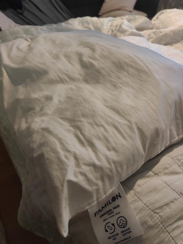 Familonin valkoinen Original High -tyyny koossa 50x60 cm. Laadukas Familon Original High -tyyny on muhkea, kimmoisa ja korkea tyyny, joka mukautuu tarpeisiisi. Sinun lisäksesi se on hyvä valinta myös ympäristölle, sillä tyyny on valmistettu 100 % luomupuuvillasta ja Social Plastic -muovista tehdystä kierrätyskuidusta.