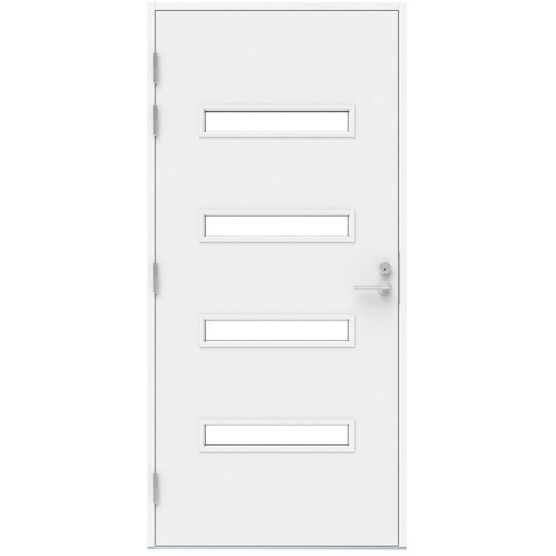 Moderni ulko-ovi, jonka sileää pintaa koristavat neljä vaakaikkunaa, jotka tuovat valoa asuntoon. Oven Termo-rakenne tukee lämmöneristystä ja matalaenergiarakentamista. Tyylikkään Pihla-ulko-oven asumismukavuutta lisäävistä ominaisuuksista voit nauttia joka päivä. Suunnittelussa on kiinnitetty erityistä huomiota energiatehokkuuteen - eristyksen ja tiiviin rakenteen ansiosta sekä kylmyys että vedontunne pysyvät poissa.