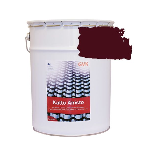 Punainen GVK:n Katto Airisto -ulkokattomaali on vesiohenteinen akrylaattipohjainen kattomaali, joka sopii mineriitti- ja betonitiilikatoille, niin uusille kuin vanhoille pinnoille. Tuotteen pakkauskoko on 18 litraa ja maalin riittoisuus on pohjan karkeudesta riippuen 3-8 m2/l.