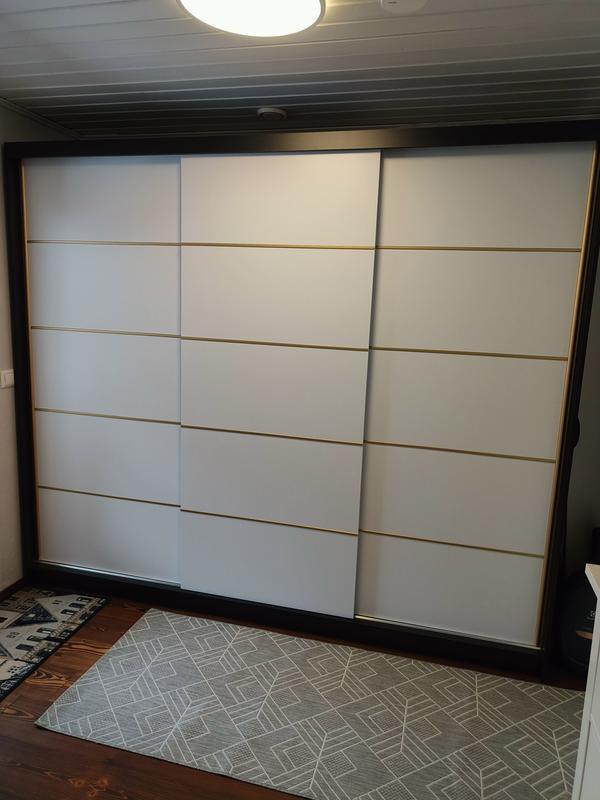 - Materiaalin tarkenne: 16mm paksu laminoitu levy, reunat viimeistelty PVC-viilulla, takaosa kuitulevyä, kaikki elementit mattapintaisia, alumiinilistat ovien suuntaisesti estävät taipumisen, mattakullanvärisiä alumiinilistoja