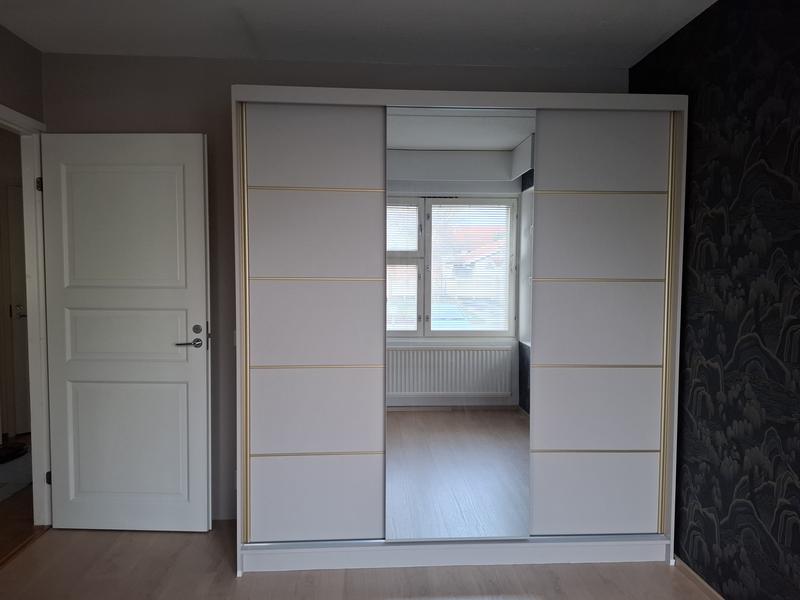 - Materiaalin tarkenne: 16mm paksu laminoitu levy, reunat viimeistelty PVC-viilulla, takaseinä kuitulevyä, alumiinilistat ovissa estävät vääntymisen, alumiinilistat kullanvärisessä mattasävyssä, 3mm paksu etupeili