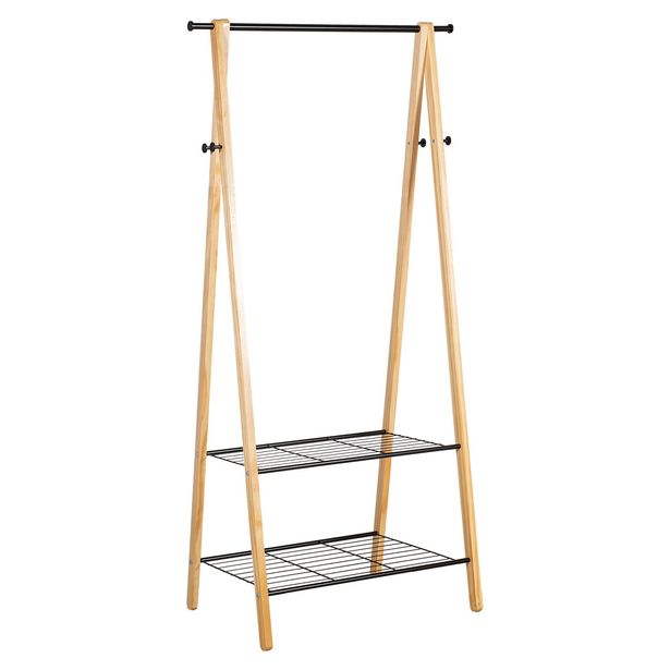 Vaateteline Forest 2 hyllyllä ja 4 koukulla 79x45x155cm, materiaali mänty/teräs, väri luonnollinen/musta. Painorajoitus ripustustanko 10kg, hyllyt 8kg.