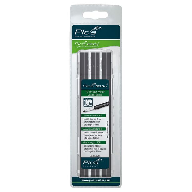 Pica Big Dry -varalyijyt 12 kpl. 12x 10H harmaa. Lyijyt kivitöihin - erittäin kestävä lyijy kiven ja betonin merkitsemiseen. Riippupakattu.