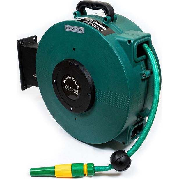 Helppo irrottaa kela kääntökiinnikkeestä. Automaattinen kelautuminen. Toimitetaan täysin varusteltuna letkun, pikaliitinten ja suuttimen kanssa.