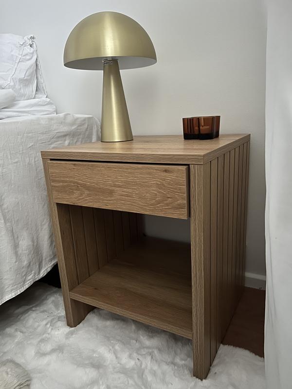 Yöpöytä Sunny laatikolla ja hyllyllä 40x40x50cm, melamiinitammi. Yöpöytä on valmistettu melamiinilevystä vaalealla tammenkuosilla. Päätypaneeleissa on tehokas 3d-viimeistely.